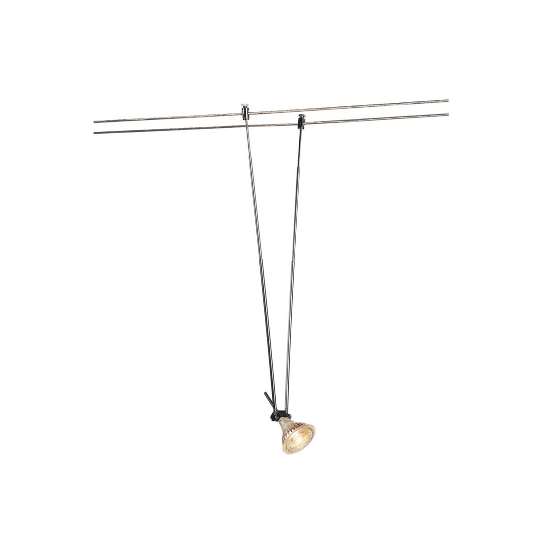 TELESKOP Strahler für das Niedervolt Seil-System dessen Halogen- sowie LED-Leuchtmittel kompatible GX5,3 Fassung an zwei schwenkbaren, Teleskopstäben befestigt ist. Der kompatible Seilabstand liegt bei 15,5 cm.