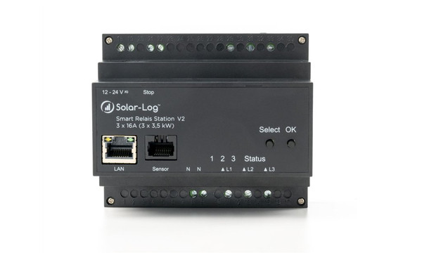 Die potenzialfreien Relais der Solar-Log™ Smart Relais Station V2 eignen sich für die Ansteuerung von Motoren, Pumpen, Lüftungs- und Klimaanlagen sowie Trocknungs- und Belüftungsanlagen. Die Solar-Log™ Smart Relais Station V2 kann bis zu drei Verbraucher direkt schalten und den Verbrauch, über den in der Box integrierten Zähler, zusätzlich erfassen. So kann die Leistungsaufnahme in der Tageskurve dargestellt und die Genauigkeit der Smart Energy Steuerung verbessert werden. Die Kommunikation zwischen der Solar-Log™ Smart Relais Station V2 und der Solar-Log™ Geräteserie erfolgt über die Netzwerkschnittstelle RJ45 (TCP/IP).