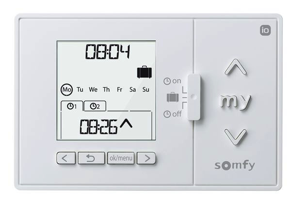Chronis io dient der zeitbasierten Automatisierung von z. B. Rollläden, Raffstoren, Markisen oder Beleuchtungsprodukten. Es steht ein Kanal für ein Produkt bzw. eine Produktgruppe zur Verfügung. Individuelle Öffnungs- und Schließzeiten für jeden Wochentag mit bis zu 4 Schaltzeiten sind einzeln programmierbar. - Großes Display mit hellblauer Hintergrundbeleuchtung für eine maximale Lesbarkeit - Copy-Paste Funktion (um die Zeiten bequem von einem Tag auf die anderen zu übertragen) - Cosmic-Programm (abends): Schließen entsprechend der vorgespeicherten (und veränderbaren) Sonnenuntergangszeiten - Drahtlos / batteriebetrieben - Unbegrenzter Erhalt der gespeicherten Schaltzeiten auch bei Batteriewechsel Lieferumfang: Funkprogrammschaltuhr io inkl. Wandhalterung, Batterien Betriebsspannung: 2 x 1,5 V DC (Batterie Typ Micro/AAA) Betriebstemperatur: 0 GradC bis 60 GradC Schutzart /Schutzklasse: IP 20 / III Sendefrequenz: 868,95 MHz, io-homecontrol Funkreichweite: 20 m durch zwei Betonwände Maße (BxHxT): 120 x 80 x 21 mm