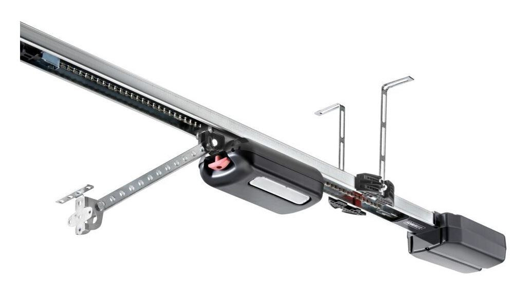 Laufwagen mit integriertem Funkempfänger (FM 868,95 MHz SOMloq2, 40 Funkspeicherplätze), LED-Beleuchtung im Laufwagen, vorprogrammierter 4-Befehl-Handsender Pearl Vibe (#?4019V000) mit fühlbarer Rückmeldung von Funkbefehlen durch Vibration, 3-teilige Laufschiene, Laufwagen, Deckensteuerung, Deckenaufhängung, Sturzbefestigung, Schubarm, Torbeschlagwinkel und Befestigungsmaterial