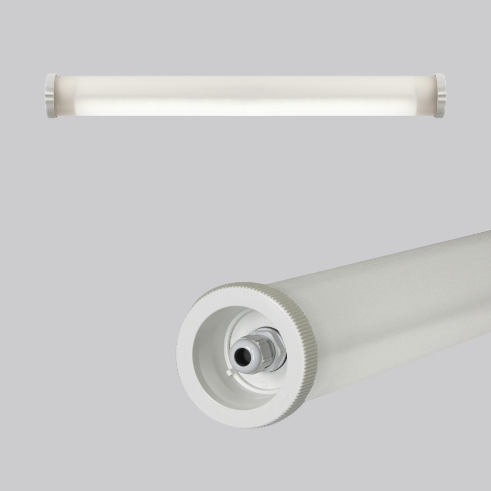Schutzrohr Kunststoff (Polycarbonat) opal, schlagzäh. Endkappen aus Kunststoff (Polyamid) grau. Homogene, weiche und blendreduzierte Ausleuchtung. Betriebsgerät integriert. 2 Kabeleinführungen. Leuchte mit integrierter 3-poliger Durchgangsverdrahtung für das Aneinanderreihen von weiteren Leuchten. Durch Zubehör (optional) für Wand-, Decken- und Pendelmontage geeignet. Zur Leuchte ist immer ein Montagezubehör mit zu bestellen. Leuchte mit begrenzter Oberflächentemperatur nach DIN EN 60598-2-24.