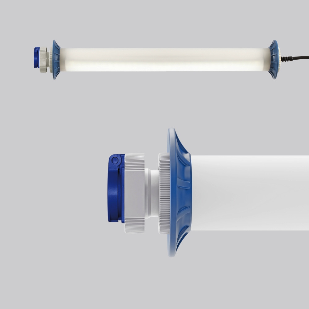 Schutzrohr Kunststoff (Polycarbonat) opal, schlagzäh. Endkappen aus Kunststoff (Polyamid) grau. Protektoren aus weichem Kunststoff an den Enden zum Schutz beim mobilen Einsatz. Homogene, weiche und blendreduzierte Ausleuchtung. Betriebsgerät integriert. Eine Steckdose ermöglicht den Anschluss weiterer Leuchten oder elektrischer Geräte. Schwere Gummischlauchzuleitung H07RN-F für hohe mechanische Belastungen mit Netzstecker. Durch Zubehör (optional) für Wand-, Decken- und Pendelmontage geeignet. Zur Leuchte ist immer ein Montagezubehör mit zu bestellen. Leuchte mit begrenzter Oberflächentemperatur nach DIN EN 60598-2-24.
