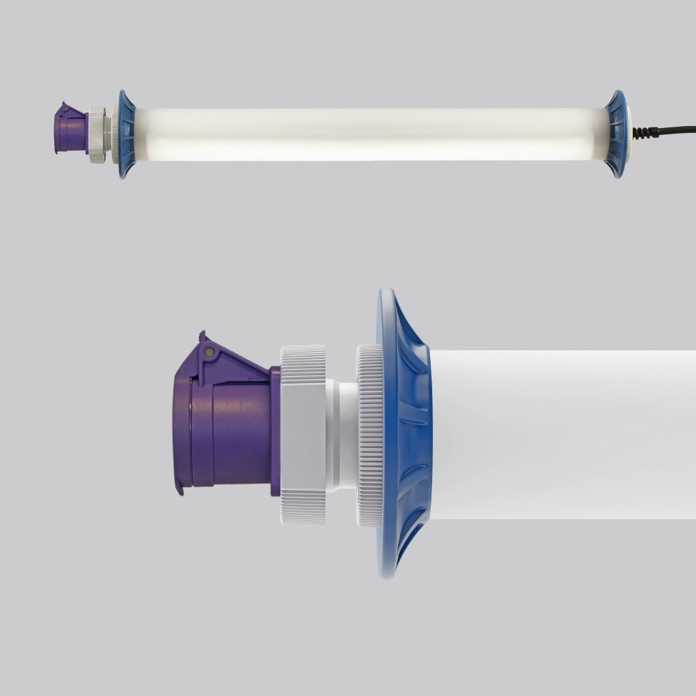 Kurzbeschreibung Schutzrohrleuchte, 24VAC, IP44, SKL III, 2 LED-Panel, Schutzrohr opal, Endkappen grau, 5m Zuleitung H07RN-F mit CEE-Stecker und CEE-