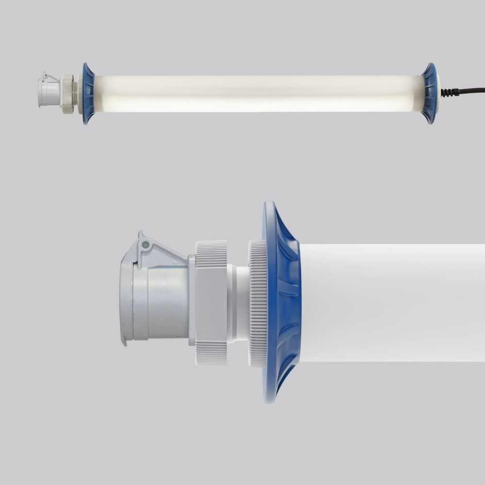 Schutzrohr Kunststoff (Polycarbonat) opal, schlagzäh. Endkappen aus Kunststoff (Polyamid) grau. Protektoren aus weichem Kunststoff an den Enden zum Schutz beim mobilen Einsatz. Homogene, weiche und blendreduzierte Ausleuchtung. Betriebsgerät integriert. Eine Steckdose ermöglicht den Anschluss weiterer Leuchten oder elektrischer Geräte. Schwere Gummischlauchzuleitung H07RN-F für hohe mechanische Belastungen mit Netzstecker. Durch Zubehör (optional) für Wand-, Decken- und Pendelmontage geeignet. Zur Leuchte ist immer ein Montagezubehör mit zu bestellen. Leuchte mit begrenzter Oberflächentemperatur nach DIN EN 60598-2-24.