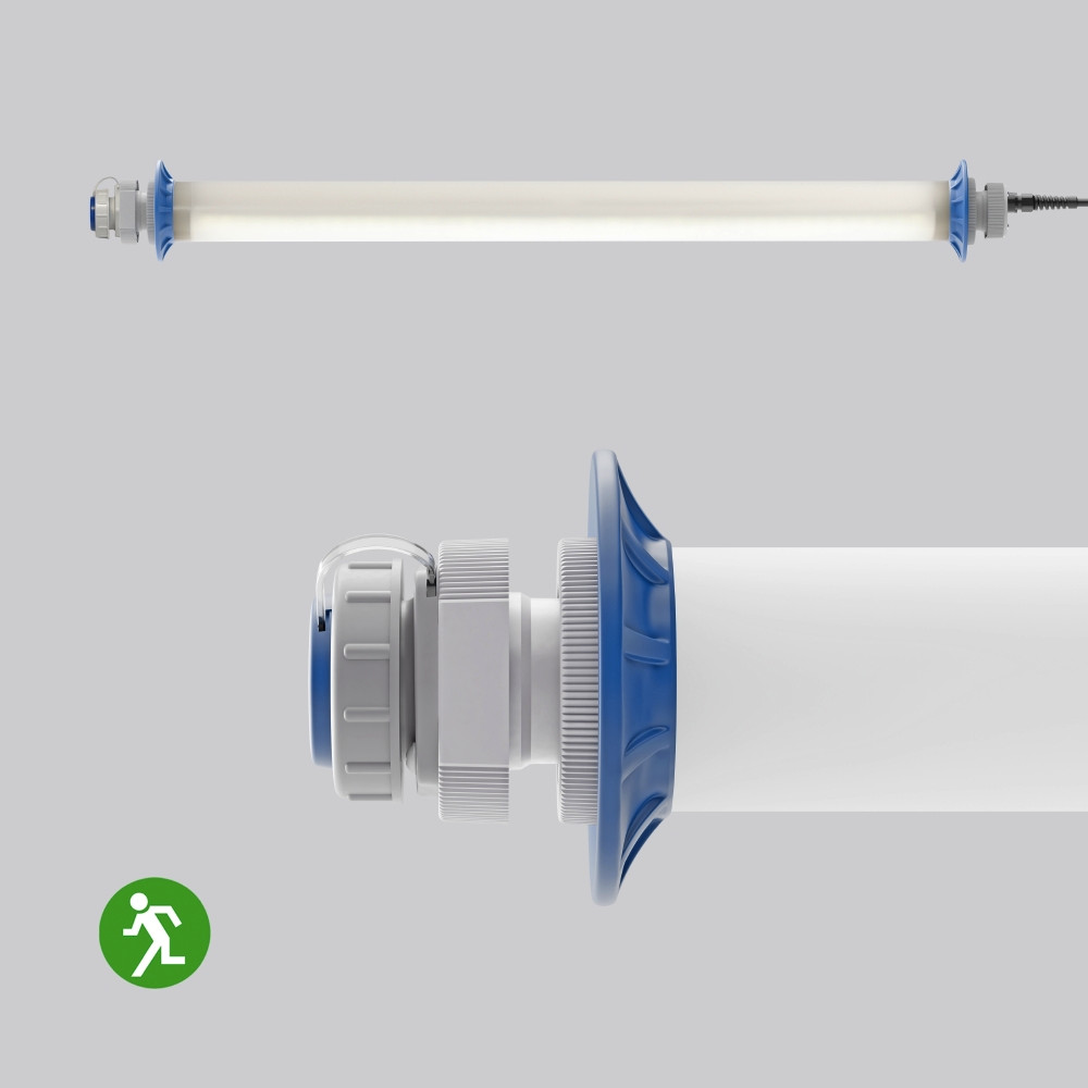 Schutzrohr Kunststoff (Polycarbonat) opal, schlagzäh. Endkappen aus Kunststoff (Polyamid) grau. Protektoren aus weichem Kunststoff an den Enden zum Schutz beim mobilen Einsatz. Homogene, weiche und blendreduzierte Ausleuchtung. Schwere Gummischlauchzuleitung H07RN-F für hohe mechanische Belastungen mit Netzstecker. Eine Steckdose ermöglicht den Anschluss weiterer Leuchten oder elektrischer Geräte. Durch Zubehör (optional) für Wand-, Decken, und Pendelmontage geeignet. Zur Leuchte ist immer ein Montagezubehör mit zu bestellen. Leuchte mit begrenzter Oberflächentemperatur nach DIN EN 60598-2-24. Notlichtfunktion: Bei einem Stromausfall schaltet die Leuchte in den Notlichtbetrieb mit reduziertem Leuchtenlichtstrom. Die maximale Leuchtdauer im Notlichtbetrieb beträgt bei vollständig geladenem Akku 120 min. Notlichtfunktion für Transport oder Lagerung deaktivierbar.