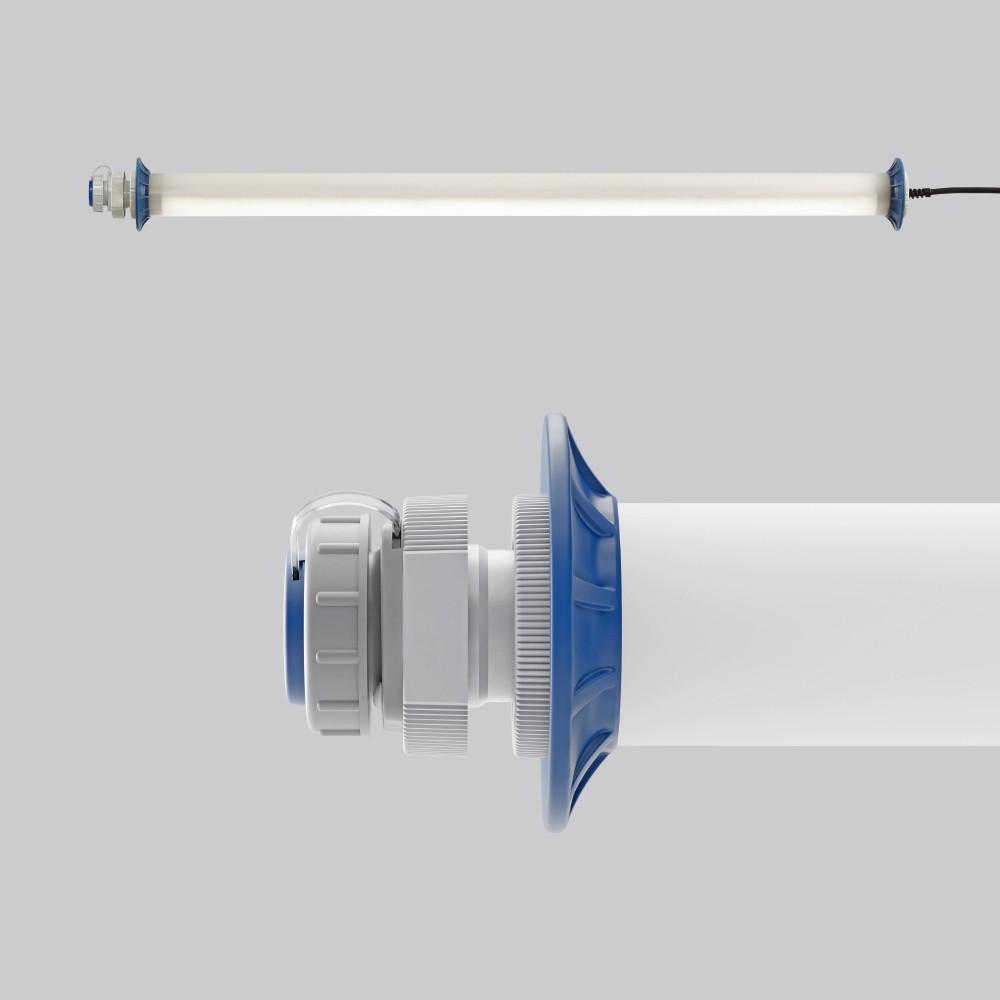 Schutzrohr Kunststoff (Polycarbonat) opal, schlagzäh. Endkappen aus Kunststoff (Polyamid) grau. Protektoren aus weichem Kunststoff an den Enden zum Schutz beim mobilen Einsatz. Homogene, weiche und blendreduzierte Ausleuchtung. Betriebsgerät integriert. Eine Steckdose ermöglicht den Anschluss weiterer Leuchten oder elektrischer Geräte. Schwere Gummischlauchzuleitung H07RN-F für hohe mechanische Belastungen mit Netzstecker. Durch Zubehör (optional) für Wand-, Decken- und Pendelmontage geeignet. Zur Leuchte ist immer ein Montagezubehör mit zu bestellen. Leuchte mit begrenzter Oberflächentemperatur nach DIN EN 60598-2-24.
