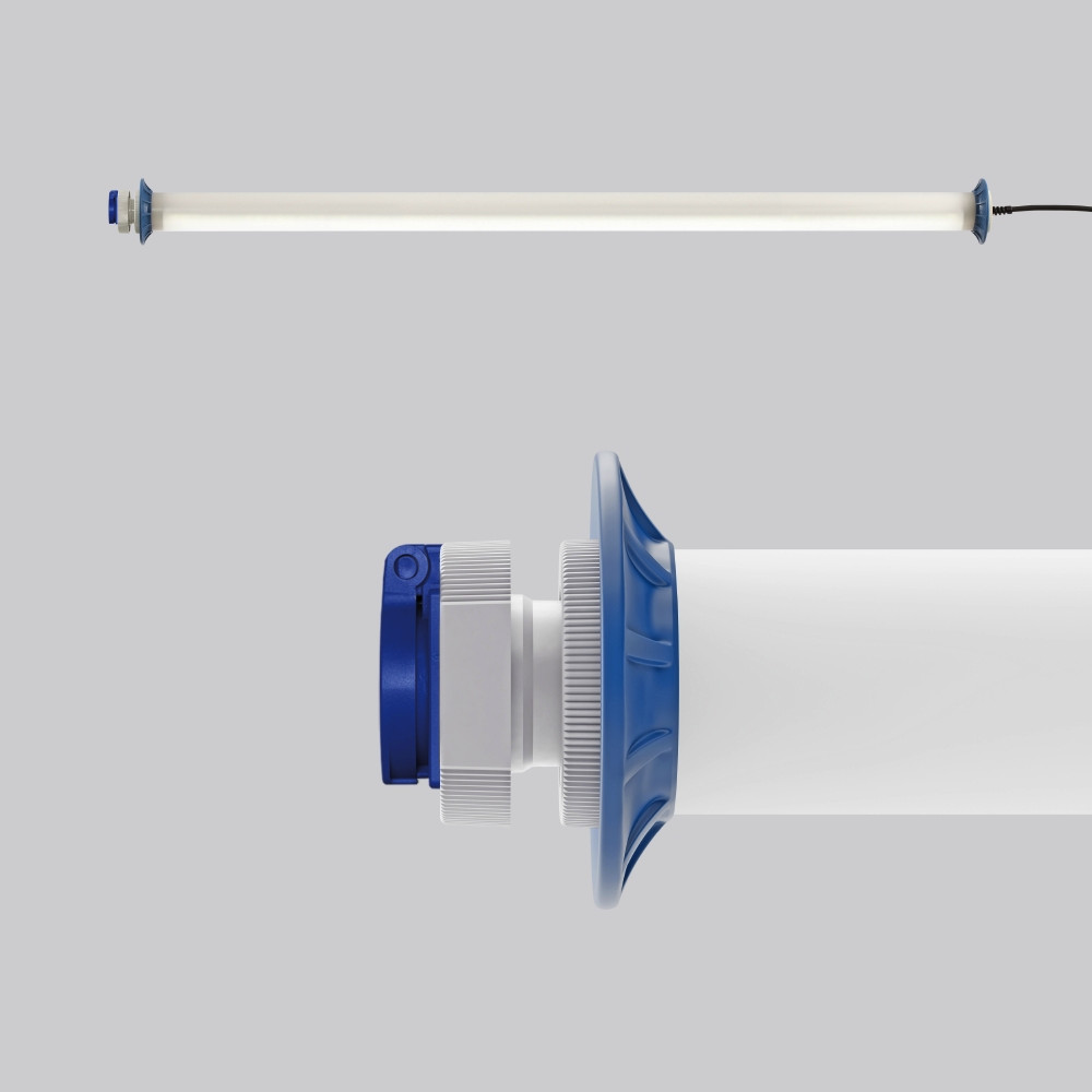 Schutzrohr Kunststoff (Polycarbonat) opal, schlagzäh. Endkappen aus Kunststoff (Polyamid) grau. Protektoren aus weichem Kunststoff an den Enden zum Schutz beim mobilen Einsatz. Homogene, weiche und blendreduzierte Ausleuchtung. Betriebsgerät integriert. Eine Steckdose ermöglicht den Anschluss weiterer Leuchten oder elektrischer Geräte. Schwere Gummischlauchzuleitung H07RN-F für hohe mechanische Belastungen mit Netzstecker. Durch Zubehör (optional) für Wand-, Decken- und Pendelmontage geeignet. Zur Leuchte ist immer ein Montagezubehör mit zu bestellen. Leuchte mit begrenzter Oberflächentemperatur nach DIN EN 60598-2-24.