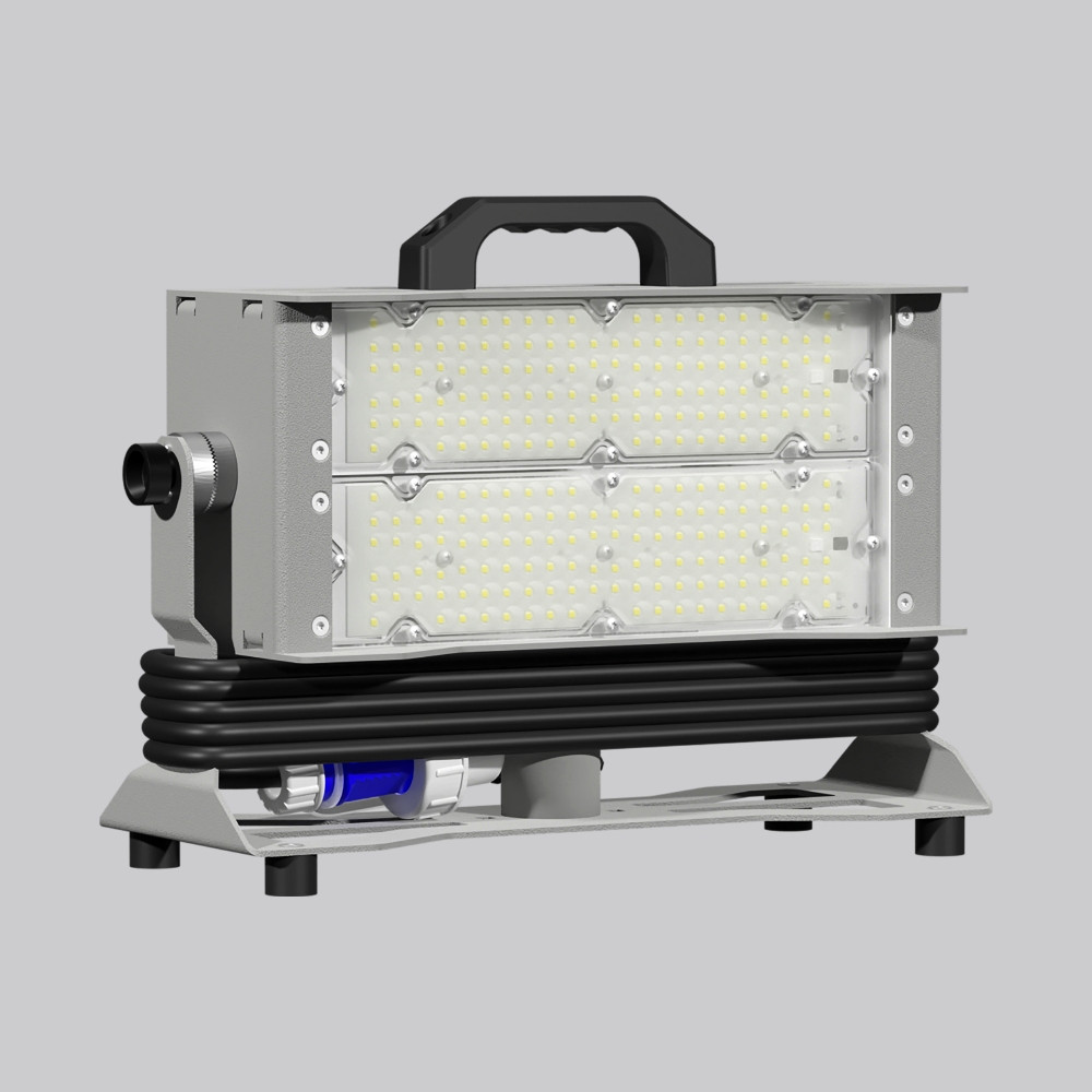 Mobiler LED-Strahler. Gehäuse Aluminium pulverbeschichtet. Fußplatte aus Stahl, pulverbeschichtet, mit Gummi-Füßen. Hocheffiziente LED-Einheiten mit optimaler Lichtlenkung durch präzise Linsenoptik aus Kunststoff (PC) klar. Lichtrichtung feinstufig einstellbar. Als Bodenleuchte oder auf Stativ einsetzbar. Aufnahmehülse für Stativ-Zapfen d=30mm, DIN 14640. Schwere Gummischlauchzuleitung H07RN-F für hohe mechanische Belastungen mit Netzstecker. Linsenoptik 60°.