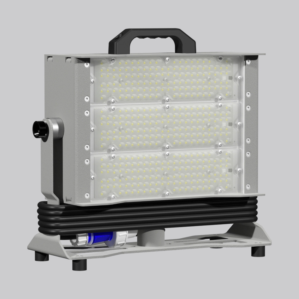 Mobiler LED-Strahler. Gehäuse Aluminium pulverbeschichtet. Fußplatte aus Stahl, pulverbeschichtet, mit Gummi-Füßen. Hocheffiziente LED-Einheiten mit optimaler Lichtlenkung durch präzise Linsenoptik aus Kunststoff (PC) klar. Lichtrichtung feinstufig einstellbar. Als Bodenleuchte oder auf Stativ einsetzbar. Aufnahmehülse für Stativ-Zapfen d=30mm, DIN 14640. Schwere Gummischlauchzuleitung H07RN-F für hohe mechanische Belastungen mit Netzstecker. Linsenoptik 90°.