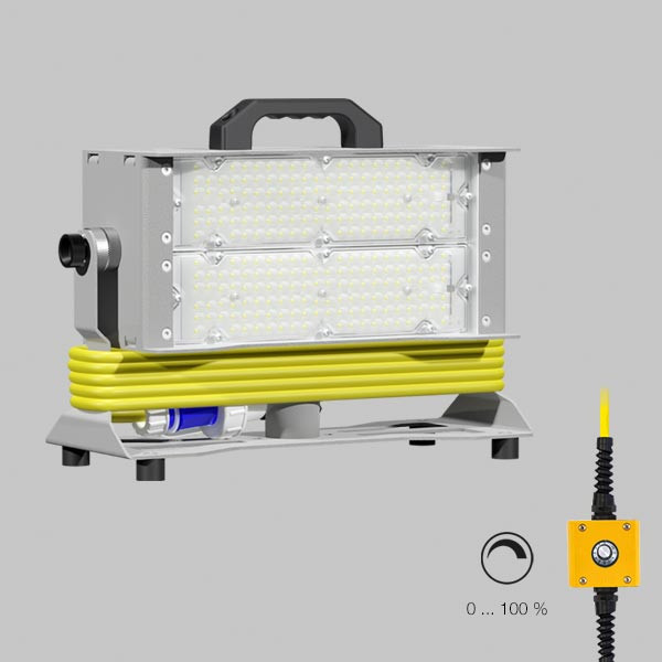 Mobiler LED-Strahler. Gehäuse Aluminium pulverbeschichtet. Fußplatte aus Stahl, pulverbeschichtet, mit Gummi-Füßen. Hocheffiziente LED-Einheiten mit optimaler Lichtlenkung durch präzise Linsenoptik aus Kunststoff (PC) klar. Lichtrichtung feinstufig einstellbar. Als Bodenleuchte oder auf Stativ einsetzbar. Aufnahmehülse für Stativ-Zapfen d=30mm, DIN 14640. Schwere Gummischlauchzuleitung H07RN-F für hohe mechanische Belastungen mit Netzstecker. Dimmbar mit Potentiometer. Linsenoptik 90°.