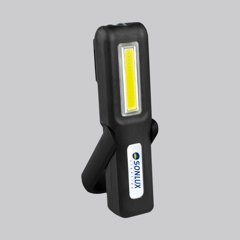 Akku-Handstableuchte. Gehäuse aus gummiertem Kunststoff. Mit Gürtelclip und ausklappbarem Haken. Verstellbarer Bügel mit integriertem Magnethalter. Leuchtdauer ca. 3 Stunden, 6.400 K, Front-LED 150 lm / Ra>80, Top-LED 50 lm / Ra>80. Ladestandsanzeige. Powerbank-Funktion. Fest integrierter Li-Ion-Akku. (1.200 mAh) Inkl. Ladekabel USB-C / USB-A.