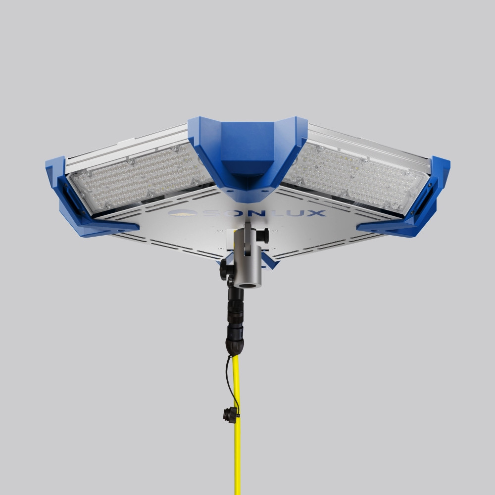 Großflächenleuchte. Gehäuse aus Aluminium, pulverbeschichtet. Ecken geschützt durch Kunststoffkappen. Hocheffiziente LED-Einheiten mit optimaler Lichtlenkung durch präzise Linsenoptik aus Kunststoff (PC) klar. Auf Stativ oder hängend einsetzbar. Robuste PUR-Schlauchleitungen H07BQ-F für hohe mechanische Belastungen mit Netzstecker. Inkl. Adapter für Zapfen-Aufnahme (d=30 mm, DIN 14640) mit der Möglichkeit einer geraden oder geneigten Montage (30, 60, 90°). Inkl. Transporttasche.