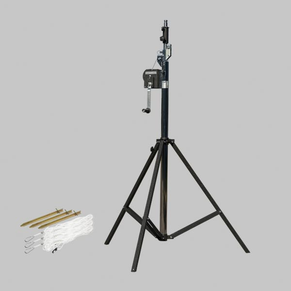 Kurbel-Stativ Lightmaxx. Stahl verzinkt, verchromt und pulverbeschichtet. Hmax 4,13 m, Hmin 1,75 m, D 1,19-1,73 m. Tragkraft 85 kg. Automatisches Sicherheitsschloss, 1 Fuß verstellbar zum Ausgleich von Geländeunebenheiten, selbstbremsende Kupplung, klappbare Kurbel. Inkl. Stativ-Adapter auf Norm-Zapfen (DIN 14640) und Abspann-Set. Packmaß: L 1.810, B 300, H 250 mm.