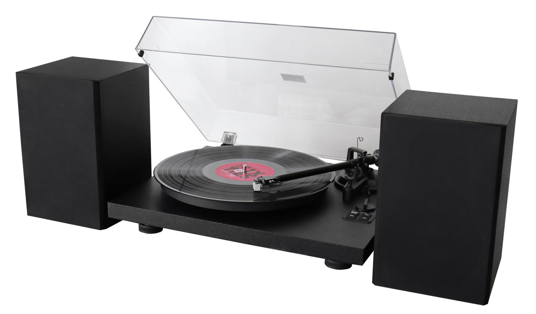 Plattenspieler 33/45 UpM, Magnettonabnehmersystem, Metall Plattenteller, Bluetooth® Empfangsfunktion, 2 Wege Bass Reflex Lautsprecher, Ausgangsleistung 2 x 18 W RMS, Eingebauter Entzerrer-Vorverstärker PHONO/LINE OUT umschaltbar, USB-Anschluss für PC-Aufnahme, Anti Skating, Tonarmauflagegewicht einstellbar, AC/DC Netzadapter (15 V/2,4 A), Single Adapter, Plattenspieler Matte, Abdeckhaube inkl.