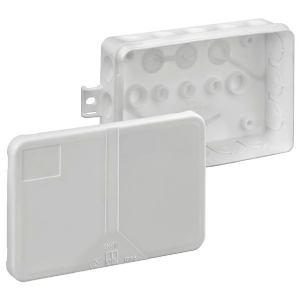 Abzweigdose, mit Schutzart IP55, Nennquerschnitt 2,5mm², Ui=400 V AC, zertifiziert durch VDE (DIN EN 60670-1/-22 (VDE 0606-1/-22)), selbstdichtende, weiche Einführungsmembranen, Dichtbereich 2-14mm, (3 rückseitig, 16 seitlich), außenliegende Befestigungsstellen, für Standardinstallationen im Innenbereich, weiß, ohne Klemmen