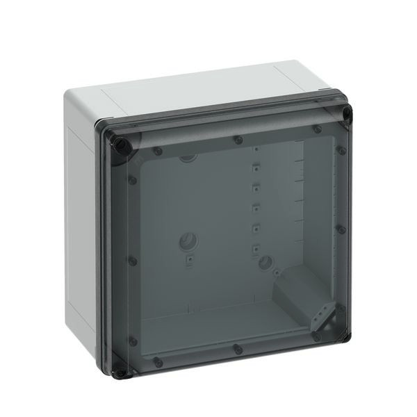 Leergehäuse - Industrie Qualität, geeignet für die Installation in rauen Umgebungen und im ungeschützten Außenbereich, Kasten: glasfaserverstärktes Polycarbonat, grau, ähnlich RAL 7035, Deckel: Polycarbonat, IP66/IP67, IK09, Schutzklasse II, Bemessungsisolationsspannung Ui 1000V AC, Bemessungsisolationsspannung Ui 1500V DC, halogenfrei, Industrie Qualität, UL, c UL us, UL Type 4x, 300 x 300 x 180, mit transparentem Deckel