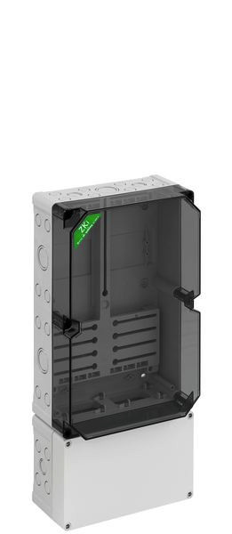 Zählergehäuse, mit transparentem Deckel, serienmäßig plombierbar, mit montiertem Zählerkreuz und Zählerbefestigungsschrauben, zusätzlicher Anschlussraum unten 150mm mit 35mm Normschiene, mit Doppelmembranstutzen, Verschluss- und Isolierstopfen, geeignet für Rundsteuerempfänger nach DIN 43861-2, für Zähler mit Drei-Punkt-Befestigung und einer Tiefe von max. 80mm