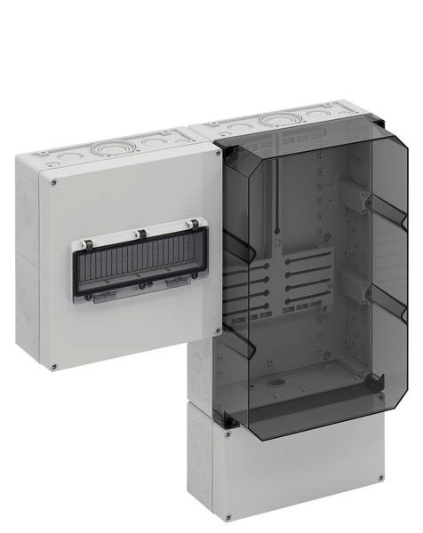 Zählerverteilung in Mehrfach-Kastenbauform nach DIN EN 61439-2/-3, serienmäßig plombierbar, zur Aufputz-Montage im ungemessenen Bereich, Geräte-Einbauflächen nach DIN 43870-1, Zähleranschlussleitungen 5-polig. Einsatz nach individueller Freigabe durch den zuständigen Netzbetreiber, mit Verschlussstopfen, mit Isolierstopfen, mit beiliegenden Belüftungsstopfen IP44 zur Verminderung von Kondenswasser, Oberer Anschlussraum, 150mm, ausgerüstet mit 35mm Normschiene zur Aufnahme der Hauptleitungsabzweigklemme HA 25-53 (Zubehör), Zählerfeld, 450mm, mit transparentem Deckel, für 1 Zähler mit Drei-Punkt-Befestigung, mit montiertem Zählerkreuz für Drehstromzähler und Zählerbefestigungsschrauben, Befestigungsmaße nach DIN 43870-2, Unterer Anschlussraum, 300mm, serienmäßig plombierbar, mit 35mm Normschiene für Hauptsicherungsautomat, mit PE/N-Doppelklemmen, mit Klappfenster 12TE für Laienbedienung der Hauptsicherungsautomaten und zusätzlichem Raum für Überspannungsschutzgeräte, Leitungseinführung durch Kabelverschraubung (IP65, Zubehör) oder Stufennippel M40 (IP55, beiliegend)