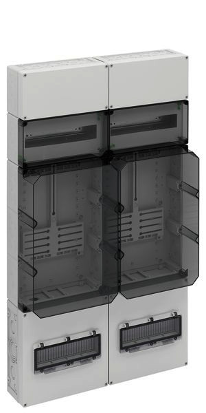 Zählerverteilung in Mehrfach-Kastenbauform nach DIN EN 61439-2/-3, serienmäßig plombierbar, zur Aufputz-Montage im ungemessenen Bereich, Geräte-Einbauflächen nach DIN 43870-1, Zähleranschlussleitungen 5-polig. Einsatz nach individueller Freigabe durch den zuständigen Netzbetreiber, mit Verschlussstopfen, mit Isolierstopfen, mit beiliegenden Belüftungsstopfen IP44 zur Verminderung von Kondenswasser, 2 Zählerfelder, je bestehend aus:, Oberer Anschlussraum, 150mm, ausgerüstet mit 35mm Normschiene zur Aufnahme der Hauptleitungsabzweigklemme HA 25-53 (Zubehör), Raum für Zusatzanwendungen, 150mm, 12TE, ausgerüstet mit 35mm Normschiene zur Aufnahme von zusätzlichen Betriebsmitteln des Netzbetreibers, Messstellenbetreibers oder Messdienstleisters, mit plombierbarer Berührungsschutzabdeckung und transparentem Deckel, Zählerfeld, 450mm, mit transparentem Deckel, für 1 Zähler mit Drei-Punkt-Befestigung, mit montiertem Zählerkreuz für Drehstromzähler und Zählerbefestigungsschrauben, Befestigungsmaße nach DIN 43870-2, Unterer Anschlussraum, 300mm, serienmäßig plombierbar, mit 5-poligem Sammelschienensystem, 40mm Sammelschienenabstand, CU12x5mm, Bemessungsstrom 160A, Icw= 25kA(0,2s), Sammelschienenklemmen, für N- und PE-Leiter, für CU-Leiter 16-35mm², mit Klappfenster 12TE für Laienbedienung der Hauptsicherungsautomaten und zusätzlichem Raum für Überspannungsschutzgeräte, Leitungseinführung durch Kabelverschraubung (IP65, Zubehör) oder Stufennippel M40 (IP55, beiliegend)