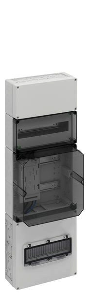 Zählerverteilung in Mehrfach-Kastenbauform nach DIN EN 61439-2/-3, serienmäßig plombierbar, zur Aufputz-Montage im ungemessenen Bereich, Geräte-Einbauflächen nach DIN 43870-1, Zähleranschlussleitungen 5-polig. Einsatz nach individueller Freigabe durch den zuständigen Netzbetreiber, mit Verschlussstopfen, mit Isolierstopfen, mit beiliegenden Belüftungsstopfen IP44 zur Verminderung von Kondenswasser, Oberer Anschlussraum, 150mm, ausgerüstet mit 35mm Normschiene zur Aufnahme der Hauptleitungsabzweigklemme HA 25-53 (Zubehör), Raum für Zusatzanwendungen, 150mm, 12TE, ausgerüstet mit 35mm Normschiene zur Aufnahme von zusätzlichen Betriebsmitteln des Netzbetreibers, Messstellenbetreibers oder Messdienstleisters, mit plombierbarer Berührungsschutzabdeckung und transparentem Deckel, Zählerfeld, 300mm, mit transparentem Deckel, mit 1 BKE-I für eHZ, erweiterbar um eine weitere BKE-I (unter Beachtung der Vorgaben der VDE AR-N 4100), Unterer Anschlussraum, 300mm, serienmäßig plombierbar, mit 35mm Normschiene für Hauptsicherungsautomat, mit PE/N-Doppelklemmen, mit Klappfenster 12TE für Laienbedienung der Hauptsicherungsautomaten und zusätzlichem Raum für Überspannungsschutzgeräte, Leitungseinführung durch Kabelverschraubung (IP65, Zubehör) oder Stufennippel M40 (IP55, beiliegend)