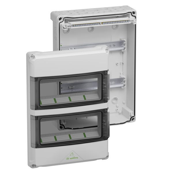 Kleinverteiler, mit Schutzart IP65, 2-reihig, 24 verfügbare Teilungseinheiten, Bemessungsbetriebsspannung: 400V AC, Bemessungsisolationsspannung: 1000V AC, 1500V DC, oben selbstdichtende, weiche Einführungsmembranen zur werkzeuglosen Leitungseinführung, unten metrische Vorprägungen für universelle Leitungseinführungen mit Kabelverschraubungen und / oder Doppelmembranstutzen, für die Standardinstallation im Innenbereich, grau, PE/N-Klemmschiene mit Schraubklemmen, jeweils 2 Klemmstellen 16mm² und 14 Klemmstellen 6mm²