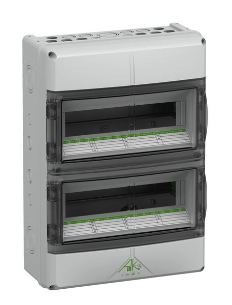 Kleinverteiler, mit Schutzart IP65, UL Type Rating 3R, 12/12K, mit integrierten Belüftungselementen zur Verminderung der Kondenswasserbildung, Bemessungsbetriebsspannung: 400V AC, Bemessungsisolationsspannung: 1000V AC, 1500V DC, zertifiziert durch VDE (DIN EN 60670-1/-24 (VDE 0606-1/-24)), UL (UL 50 & CSA 22.2 No. 94.1-07, UL 50E & CSA C22.2 No. 94.2-07), UL-EU (EN 62208), UL-EU (EN 61439-1/-2), UL-EU (EN 61439-1/-3), DLG (Ammoniakbeständigkeit), oben und unten metrische Vorprägungen für universelle Leitungseinführungen mit Kabelverschraubungen und / oder Doppelmembranstutzen, oben 10 offene Leitungseinführungen für UL-konforme Leitungseinführungen, für die Installation im industriellen Umfeld und im geschützten Außenbereich, 2-reihig, 28 Teilungseinheiten, ohne PE/N-Klemmschiene