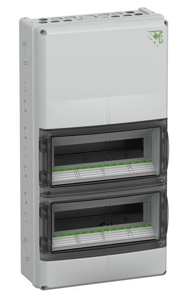Kleinverteiler, mit Schutzart IP65, UL Type Rating 3R, 12/12K, mit integrierten Belüftungselementen zur Verminderung der Kondenswasserbildung, Bemessungsbetriebsspannung: 400V AC, Bemessungsisolationsspannung: 1000V AC, 1500V DC, zertifiziert durch VDE (DIN EN 60670-1/-24 (VDE 0606-1/-24)), UL (UL 50 & CSA 22.2 No. 94.1-07, UL 50E & CSA C22.2 No. 94.2-07), UL-EU (EN 62208), UL-EU (EN 61439-1/-2), UL-EU (EN 61439-1/-3), DLG (Ammoniakbeständigkeit), oben und unten metrische Vorprägungen für universelle Leitungseinführungen mit Kabelverschraubungen und / oder Doppelmembranstutzen, oben 10 offene Leitungseinführungen für UL-konforme Leitungseinführungen, für die Installation im industriellen Umfeld und im geschützten Außenbereich, 2-reihig, 28 Teilungseinheiten, mit zusätzlichem Anschlussraum inkl. 35mm Normschiene, ohne PE/N-Klemmschiene