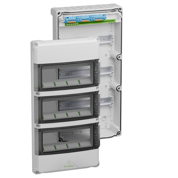 Kleinverteiler, mit Schutzart IP65, 3-reihig, 36 verfügbare Teilungseinheiten, Bemessungsbetriebsspannung: 400V AC, Bemessungsisolationsspannung: 1000V AC, 1500V DC, oben selbstdichtende, weiche Einführungsmembranen zur werkzeuglosen Leitungseinführung, unten metrische Vorprägungen für universelle Leitungseinführungen mit Kabelverschraubungen und / oder Doppelmembranstutzen, für die Standardinstallation im Innenbereich, grau, PE/N-Klemme, bestehend aus: PE-Klemmschiene mit 6 Schraubklemmen 2,5-16mm² und 21 Push-in-Klemmen 0,75-4mm², 3 N-Module (mit Steckbrücke verbunden) mit jeweils 2 Schraubklemmen 2,5-16mm² und 6 Push-in-Klemmen 0,75-4mm² mit Betätigungshebel zum werkzeuglosen Lösen der Leiter