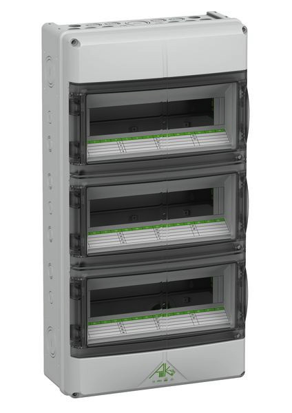 Kleinverteiler, mit Schutzart IP65, UL Type Rating 3R, 12/12K, mit integrierten Belüftungselementen zur Verminderung der Kondenswasserbildung, Bemessungsbetriebsspannung: 400V AC, Bemessungsisolationsspannung: 1000V AC, 1500V DC, zertifiziert durch VDE (DIN EN 60670-1/-24 (VDE 0606-1/-24)), UL (UL 50 & CSA 22.2 No. 94.1-07, UL 50E & CSA C22.2 No. 94.2-07), UL-EU (EN 62208), UL-EU (EN 61439-1/-2), UL-EU (EN 61439-1/-3), DLG (Ammoniakbeständigkeit), oben und unten metrische Vorprägungen für universelle Leitungseinführungen mit Kabelverschraubungen und / oder Doppelmembranstutzen, oben 10 offene Leitungseinführungen für UL-konforme Leitungseinführungen, für die Installation im industriellen Umfeld und im geschützten Außenbereich, 3-reihig, 42 Teilungseinheiten, ohne PE/N-Klemmschiene