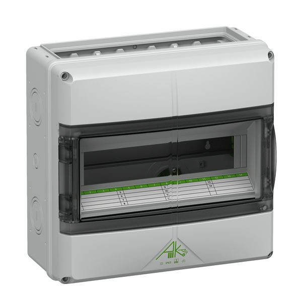 Kleinverteiler, mit Schutzart IP65, 1-reihig, 14 verfügbare Teilungseinheiten, Flansch-Type, mit integrierten Belüftungselementen zur Verminderung der Kondenswasserbildung, Bemessungsbetriebsspannung: 400V AC, Bemessungsisolationsspannung: 1000V AC, 1500V DC, zertifiziert durch VDE (DIN EN 60670-1/-24 (VDE 0606-1/-24)), UL-EU (EN 62208), UL-EU (EN 61439-1/-2), UL-EU (EN 61439-1/-3), UL-EU (EN 61439-1 & EN IEC 61439-7), DLG (Ammoniakbeständigkeit), oben und unten offene Stirnflächen zur Montage von verschiedenen Flanschen oder zur Kombination mehrerer AK-F Gehäuse mittels Kombiflansch, für die Installation im industriellen Umfeld und im geschützten Außenbereich, PE/N-Klemme, bestehend aus: PE-Klemmschiene mit 3 Schraubklemmen 2,5-16mm² und 14 Push-in-Klemmen 0,75-4mm², 2 N-Module (mit Steckbrücke verbunden) mit jeweils 2 Schraubklemmen 2,5-16mm² und 6 Push-in-Klemmen 0,75-4mm² mit Betätigungshebel zum werkzeuglosen Lösen der Leiter