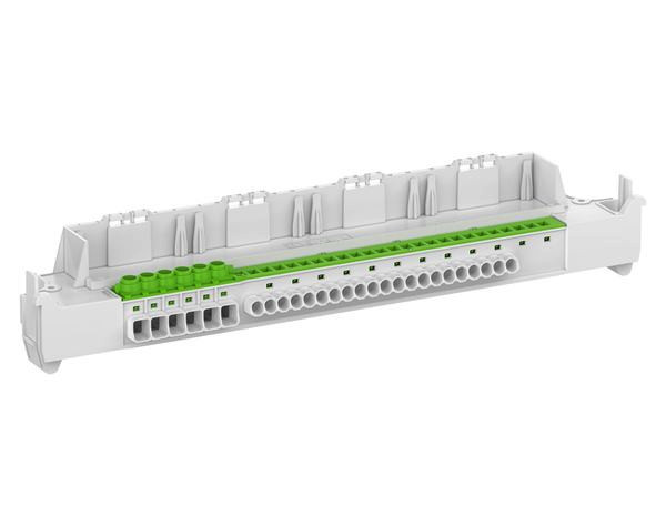 , PE-Klemmschiene mit 6 Schraubklemmen 2,5-16mm² und 21 Push-In-Klemmen 0,75-4mm², geeignet für die Aufnahme von 4 N-Modulen
