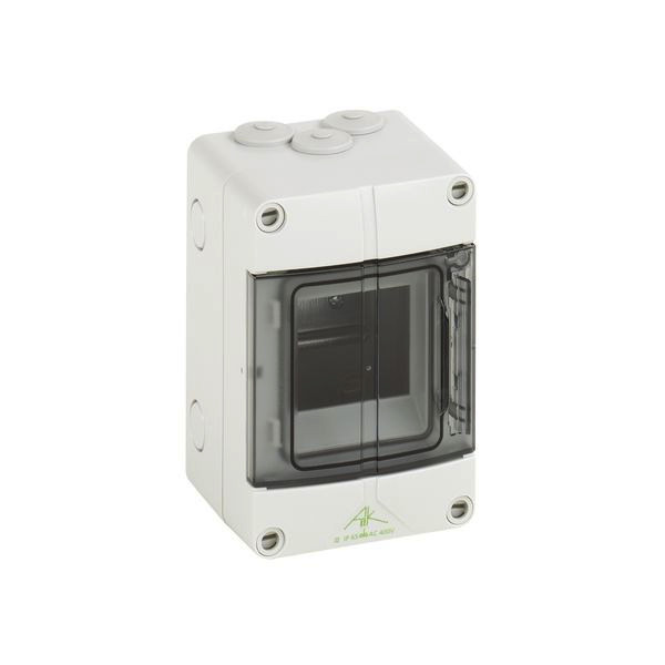 AKi: IQ Industrie Qualität (UV-beständig und halogenfrei) Kleinverteiler, mit Schutzart IP65, 1-reihig, 3 verfügbare Teilungseinheiten, Bemessungsbetriebsspannung: 400V AC, Bemessungsisolationsspannung: 1000V AC, 1000V DC, oben und unten metrische Vorprägungen für universelle Leitungseinführungen mit Kabelverschraubungen und / oder Doppelmembranstutzen, oben mit elastischen Einführungen DMS M20 vorbestückt, für die Installation im industriellen Umfeld und im geschützten Außenbereich, mit PE/N-Klemmschiene mit jeweils 1 Klemmstelle 16mm² und 3 Klemmstellen 6mm²