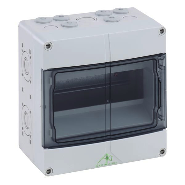 AKi: IQ Industrie Qualität (UV-beständig und halogenfrei) Kleinverteiler, mit Schutzart IP65, 1-reihig, 9 verfügbare Teilungseinheiten, Bemessungsbetriebsspannung: 400V AC, Bemessungsisolationsspannung: 1000V AC, 1000V DC, oben und unten metrische Vorprägungen für universelle Leitungseinführungen mit Kabelverschraubungen und / oder Doppelmembranstutzen, oben mit elastischen Einführungen DMS M20 vorbestückt, für die Installation im industriellen Umfeld und im geschützten Außenbereich, mit PE/N-Klemmschiene mit jeweils 2 Klemmstellen 16mm² und 5 Klemmstellen 6mm²