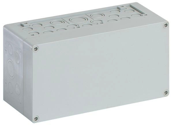 Leergehäuse, mit Schutzart IP65, Polycarbonat, glasfaserverstärkt, Ui=690V AC, Ui=1000V DC, innenliegende Befestigungsstellen, für Installationen im industriellen Umfeld und geschütztem Außenbereich, Kasten: Polycarbonat, glasfaserverstärkt, Deckel: Polycarbonat, grau, Ausschlagmembranen, M20/M25/M32/M40, (46 seitlich)