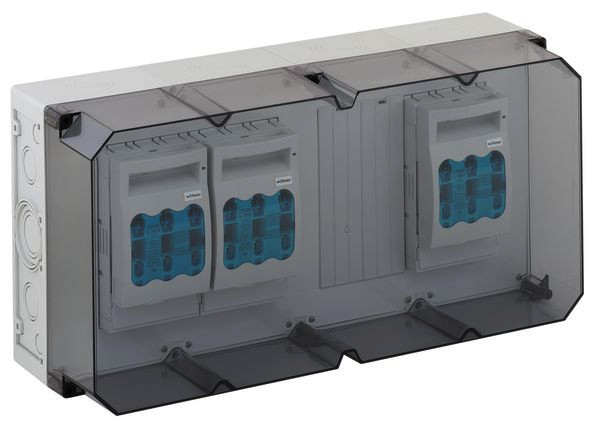 | Kurzbeschreibung | Reiterlasttrennergehäuse, transparent, Schutzart IP54/IP65, Schlagfestigkeit IK08, Schutzklasse II, Bemessungsspannung 690V AC, halogenfrei |