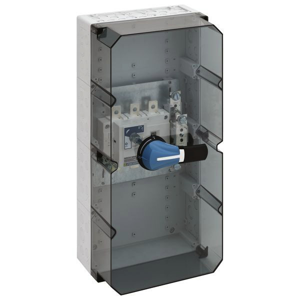 Lasttrennschaltergehäuse mit externer Betätigung, abschließbar, 1 x Lasttrennschalter 250A, 3-polig schaltend, Schraubanschluss M10, PE/N-Klemme M10, mit Isolierstopfen, mit transparentem Deckel