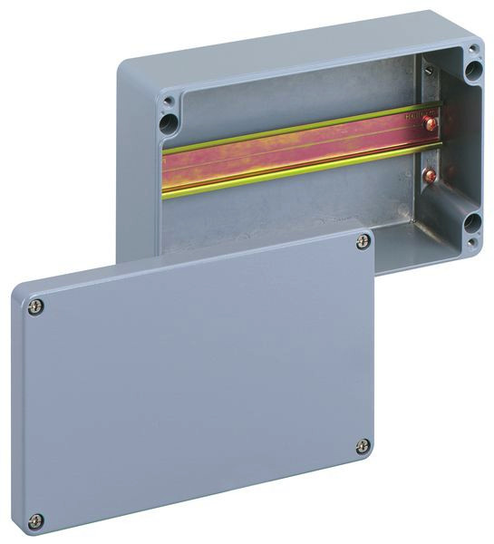 Aluminium-Gehäuse mit Reihenklemmen - Industrie Qualität - pulverbeschichtet RAL 7001 Reihenklemmengehäuse, mit Schutzart IP66, Nennquerschnitt 4mm², Ui=400V AC, Aluminium pulverlackbeschichtet, innenliegende Befestigungsstellen, für Installationen im industriellen Umfeld und geschütztem Außenbereich, ohne Klemmen, mit Tragschiene NS35