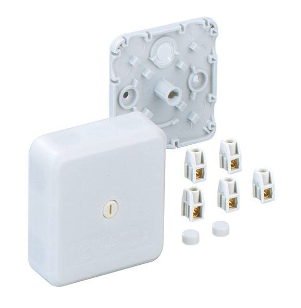 7 ausschneidbare Einführungen für Flach- und Rundleitungen von 5,5-12 mm Ø, 1 Rückeinführung bis 15 mm Ø, zentraler Deckelschnellverschluss Abzweigdose, mit Schutzart IP30, Nennquerschnitt 2,5mm², Ui=400 V AC, zertifiziert durch VDE (DIN EN 60670-1/-22 (VDE 0606-1/-22)), Ausschlagmembranen, (1 rückseitig, 7 seitlich), innenliegende Befestigungsstellen, für Standardinstallationen im Innenbereich, grau, In=24 A, mit weißem Oberteil und 5 aneinanderreihbaren Schraubklemmen 2,5mm² (5 x1² / 5 x 1,5² / 3 x 2,5²)