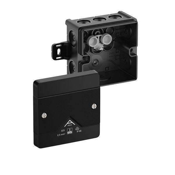 Abzweigkasten, mit Schutzart IP66, Nennquerschnitt 2,5mm², zertifiziert durch VDE (DIN EN 60670-1/-22 (VDE 0606-1/-22)), DLG (Ammoniakbeständigkeit), selbstdichtende, weiche Einführungsmembranen, M16/M20, Dichtbereich 4-16mm, (1 rückseitig, 8 seitlich), außenliegende Befestigungsstellen, für Standardinstallationen im Innenbereich und geschütztem Außenbereich, schwarz, Ui=1000 V AC, ohne Klemmen