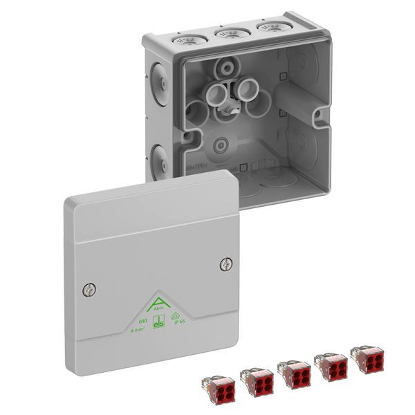 Abzweigkasten, mit Schutzart IP66, Nennquerschnitt 4mm², zertifiziert durch VDE (DIN EN 60670-1/-22 (VDE 0606-1/-22)), DLG (Ammoniakbeständigkeit), selbstdichtende, weiche Einführungsmembranen, M20/M25, Dichtbereich 4-21mm, (1 rückseitig, 10 seitlich), innenliegende Befestigungsstellen, für Standardinstallationen im Innenbereich und geschütztem Außenbereich, grau, Ui=400 V AC, In=32 A, mit 5 schraubenlosen 4-Leiter-Klemmen Wago 773-604, max. Nennquerschnitt nach DIN EN 60998: 4mm², klemmbare Querschnitte pro Pol: 4 x 1,5-4,0mm² starr Cu/Al (Montageanleitung beachten!)