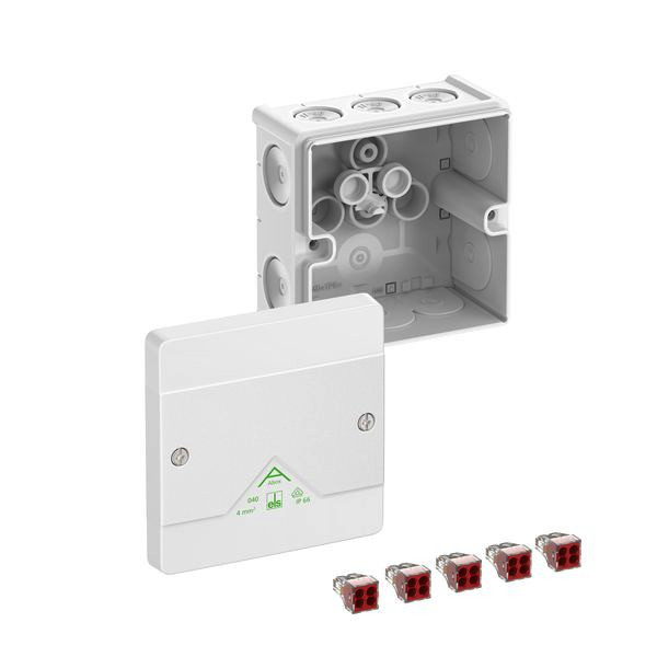 Abzweigkasten, mit Schutzart IP66, Nennquerschnitt 4mm², zertifiziert durch VDE (DIN EN 60670-1/-22 (VDE 0606-1/-22)), DLG (Ammoniakbeständigkeit), selbstdichtende, weiche Einführungsmembranen, M20/M25, Dichtbereich 4-21mm, (1 rückseitig, 10 seitlich), innenliegende Befestigungsstellen, für Standardinstallationen im Innenbereich und geschütztem Außenbereich, weiß, Ui=400 V AC, In=32 A, mit 5 schraubenlosen 4-Leiter-Klemmen Wago 773-604, max. Nennquerschnitt nach DIN EN 60998: 4mm², klemmbare Querschnitte pro Pol: 4 x 1,5-4,0mm² starr Cu/Al (Montageanleitung beachten!)