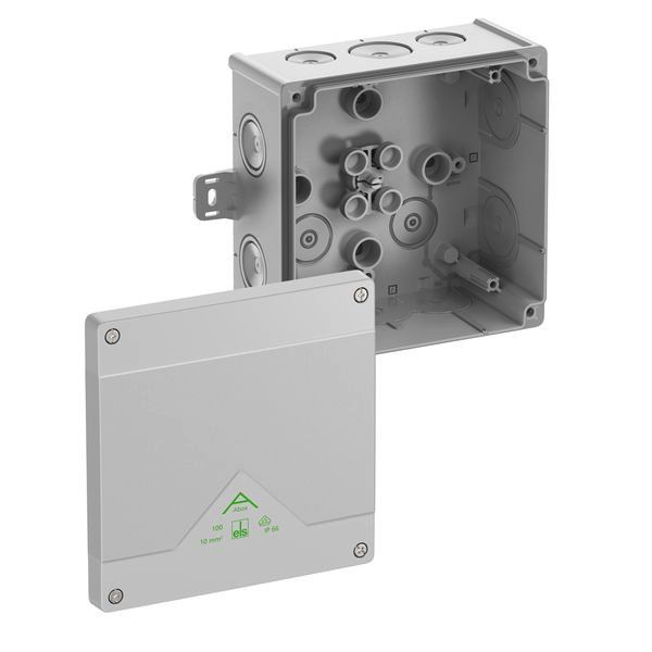 Abzweigkasten, mit Schutzart IP66, Nennquerschnitt 10mm², zertifiziert durch VDE (DIN EN 60670-1/-22 (VDE 0606-1/-22)), DLG (Ammoniakbeständigkeit), selbstdichtende, weiche Einführungsmembranen, M20/M25/M32, Dichtbereich 8-28mm, (2 rückseitig, 10 seitlich), außenliegende Befestigungsstellen, für Standardinstallationen im Innenbereich und geschütztem Außenbereich, grau, Ui=1000 V AC, ohne Klemmen