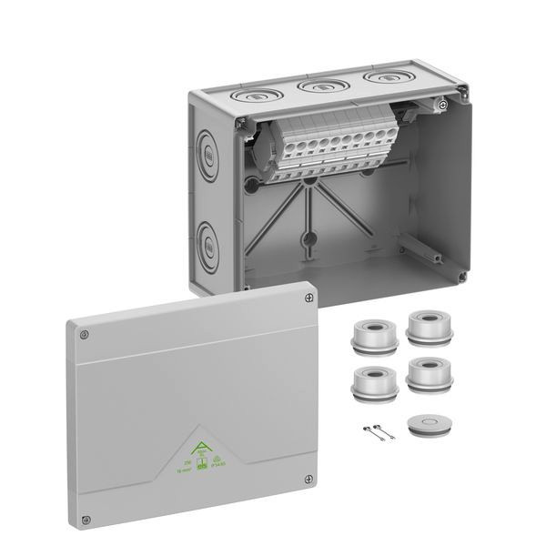 Abzweigkasten, mit Schutzart IP55/IP66, Nennquerschnitt 16mm², Ui=690 V AC, zertifiziert durch VDE (DIN EN 60670-1/-22 (VDE 0606-1/-22)), DLG (Ammoniakbeständigkeit), Ausschlagmembranen, M20/M25/M32/M40/M50, (4 rückseitig, 10 seitlich), innenliegende Befestigungsstellen, mit schraubenlosen Klemmen, für Standardinstallationen im Innenbereich und geschütztem Außenbereich, grau, In=76 A, mit hochliegender, schraubenloser Klemme Wago 2016-1201, 5-polig, max. Nennquerschnitt nach DIN EN 60998:16mm², klemmbare Querschnitte pro Pol: 4 x 0,5 bis 16mm², starr Cu, 4 x 0,5 bis 25mm² flexibel Cu
