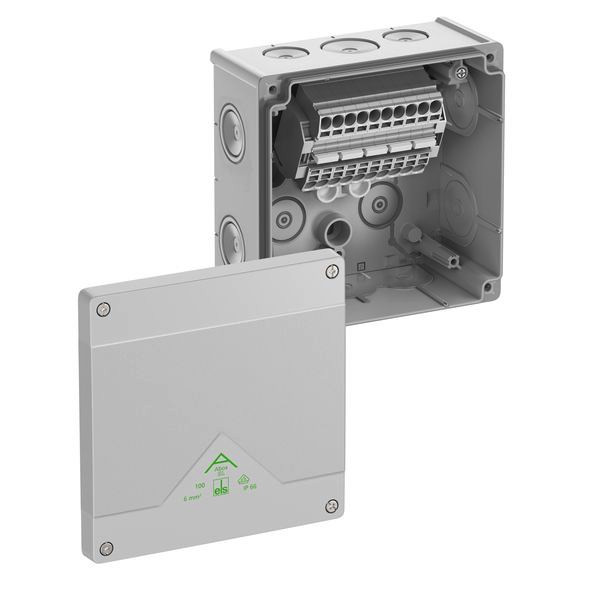 Abzweigkasten, mit Schutzart IP66, Nennquerschnitt 6mm², Ui=690 V AC, zertifiziert durch VDE (DIN EN 60670-1/-22 (VDE 0606-1/-22)), DLG (Ammoniakbeständigkeit), selbstdichtende, weiche Einführungsmembranen, M20/M25/M32, Dichtbereich 8-28mm, (2 rückseitig, 10 seitlich), innenliegende Befestigungsstellen, mit schraubenlosen Klemmen, für Standardinstallationen im Innenbereich und geschütztem Außenbereich, grau, In=41 A, mit hochliegender, schraubenloser Klemme Wago 2006-1201, 5-polig, max. Nennquerschnitt nach DIN EN 60998: 6mm², klemmbare Querschnitte pro Pol: 4 x 0,5 bis 10mm² starr/ flexibel Cu