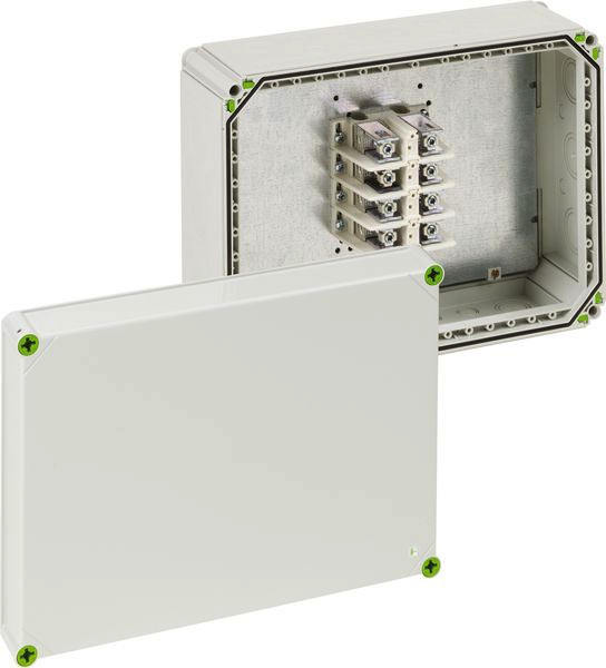Abzweigkasten, mit Schutzart IP65, Nennquerschnitt 150mm², Ui=690 V AC, Ausschlagmembranen, M16/M20/M25/M32/M40/M50, (24 seitlich), innenliegende Befestigungsstellen, für Installationen im industriellen Umfeld und geschütztem Außenbereich, grau, mit Spezial-Schraubklemme für Leitereinführung von oben, 4-polig-150² (16 bis 150mm², CU/AL)