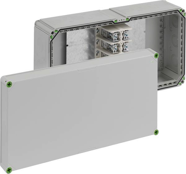 Abzweigkasten, mit Schutzart IP65, Nennquerschnitt 240mm², Ui=690 V AC, Ausschlagmembranen, M16/M40/M50, (30 seitlich), innenliegende Befestigungsstellen, für Installationen im industriellen Umfeld und geschütztem Außenbereich, grau, mit Spezial-Schraubklemme für Leitereinführung von oben, 5-polig-240² (25 bis 240mm², CU/AL)
