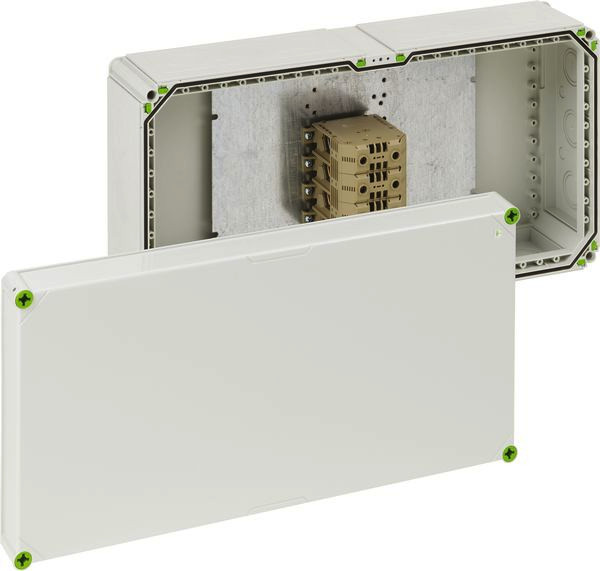 Industrie Qualität-, Ui=690V, witterungsbeständig, schlagfest, Halogenfrei, plombierbar, mit Reihenklemmenbestückung, passende Kabeleinführungen siehe Zubehör, Schutzart IP65, bis 240², Schlagfestigkeit IK08, Schutzklasse II, Bemessungsisolationsspannung Ui 690VAC/DC, mit Reihenklemme 4-polig - 120 - 240 mm²