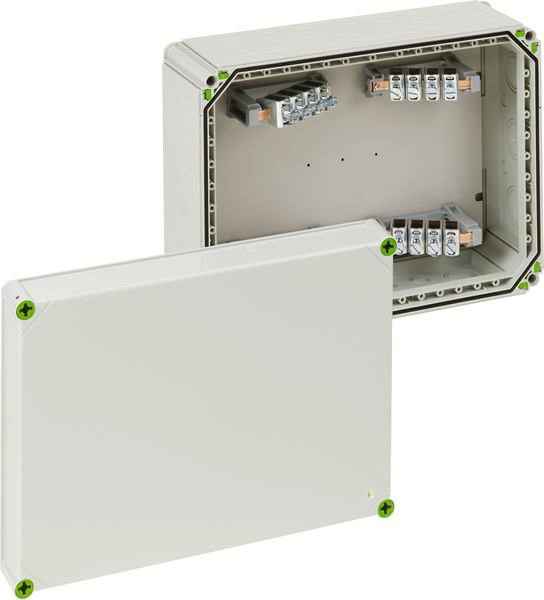 Abzweigkasten, mit Schutzart IP65, Nennquerschnitt 70mm², Ui=690 V AC, Ausschlagmembranen, M16/M20/M25/M32/M40/M50, (24 seitlich), innenliegende Befestigungsstellen, für Installationen im industriellen Umfeld und geschütztem Außenbereich, grau, mit Schraubklemme 4-polig-70² (16-70²)
