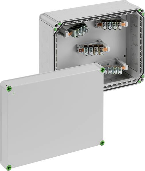 Abzweigkasten, mit Schutzart IP65, Nennquerschnitt 70mm², Ui=690 V AC, Ausschlagmembranen, M16/M20/M25/M32/M40/M50, (24 seitlich), innenliegende Befestigungsstellen, für Installationen im industriellen Umfeld und geschütztem Außenbereich, grau, mit Schraubklemme 5-polig-70² (16-70²)
