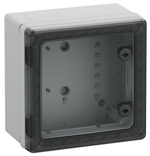 Schaltschrank, geeignet für die Installation in rauen Umgebungen und im ungeschützten Außenbereich, Kasten und Rahmen: glasfaserverstärktes Polycarbonat, grau, ähnlich RAL 7035, Tür: Polycarbonat.